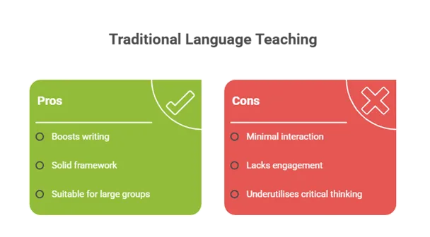 Traditional language learning approaches have ruled language acquisition globally. The below-shared approaches focus on strict structure, memorisation, and repetition.